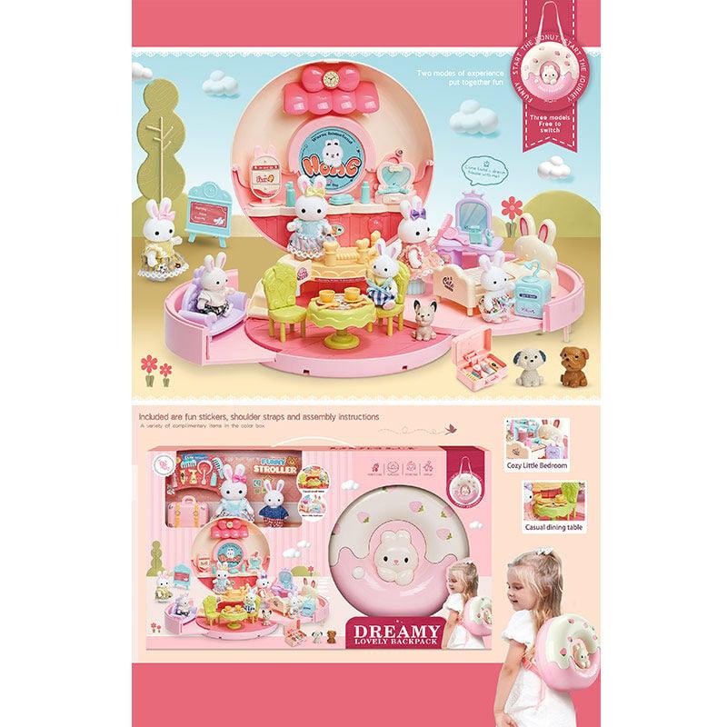 Будиночок у вигляді симпатичного пончика, в якому мешкає сім’я зайчиків. Будиночок укомплектований всім необхідним для повноцінного проживання - є необхідні меблі, посуд, аксесуари, і навіть двоє маленьких улюбленців-собачок. Набір розвиває соціальні навички дитини, стимулює занурення до рольових ігор та розвинення фантазії. За допомогою даного набору можливо розіграти безліч рольових ігрових сценаріїв. Особливості: - функціональний будиночок у вигляді пончика, - сім’я зайчиків, - набір меблів, - набір посуду, - два улюбленці, - ремінець для складеного будиночка, що дозволяє використовувати його як сумочку для перенесення.